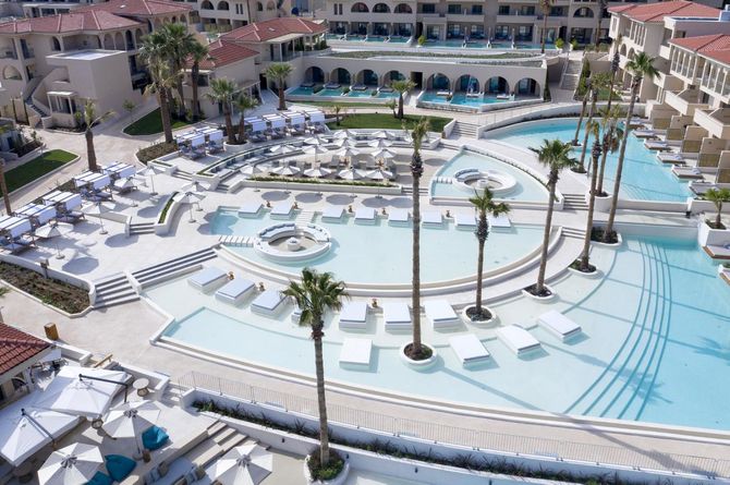 Das Hotel verbindet die zeitlose Schönheit der Natur mit einem modernen und ruhigen Lebensstil und bietet einen einladenden Empfangsbereich mit Réception und WLAN (gratis). Internationales Buffet-Hauptrestaurant, 2 A-la-carte-Restaurants mit italienischer, japanischer und griechischer Küche, Food Truck, Lobbybar, Poolbar, Bar. Im modernen Aussenbereich befinden sich 2 Pools (1 davon Adults only) mit Sonnenterrassen. Die Nutzung von Liegestühlen, Sonnenschirmen und Badetüchern am Pool und am Strand ist gratis. Parkplatz gratis (nach Verfügbarkeit).