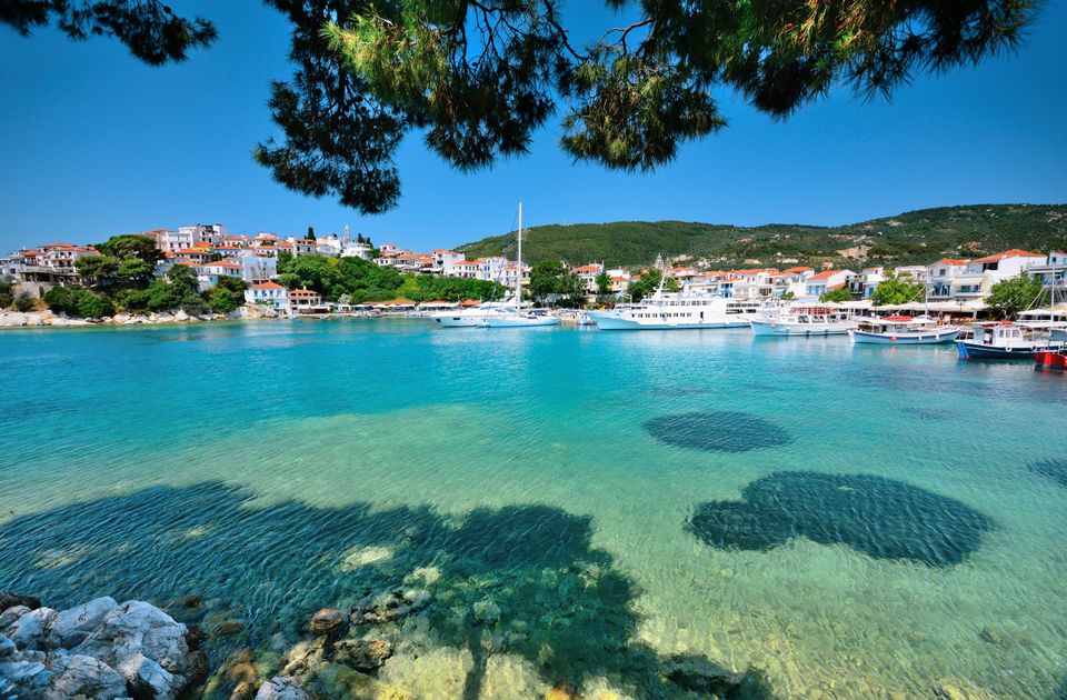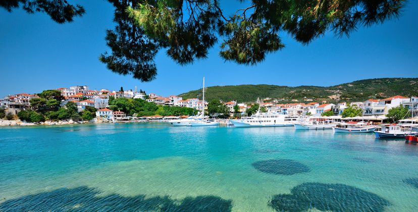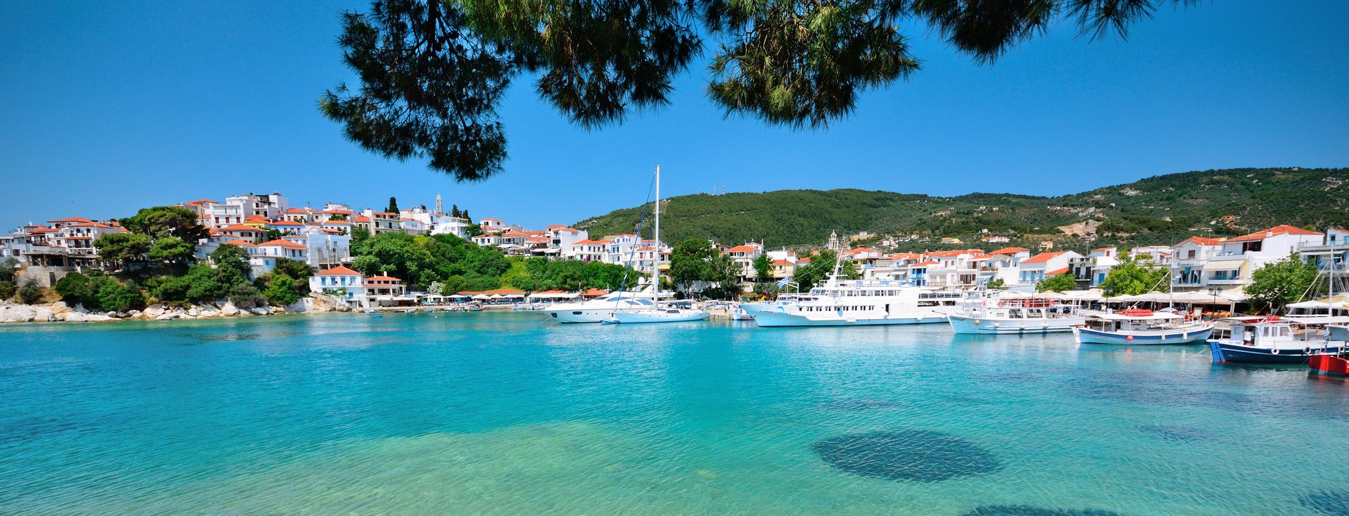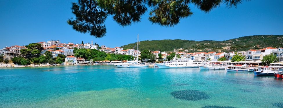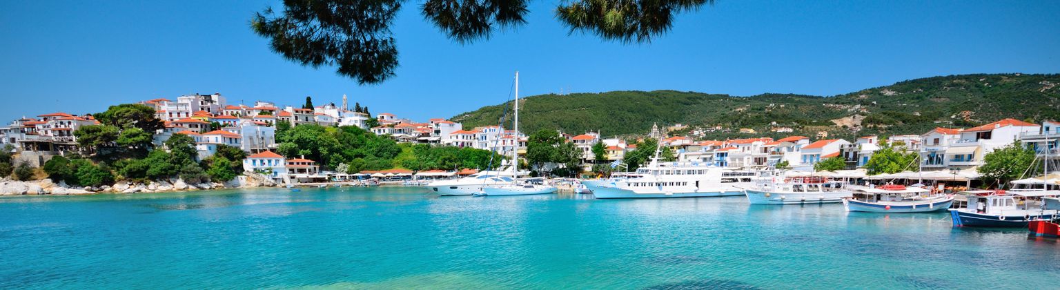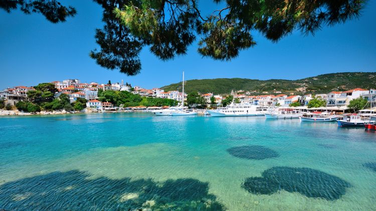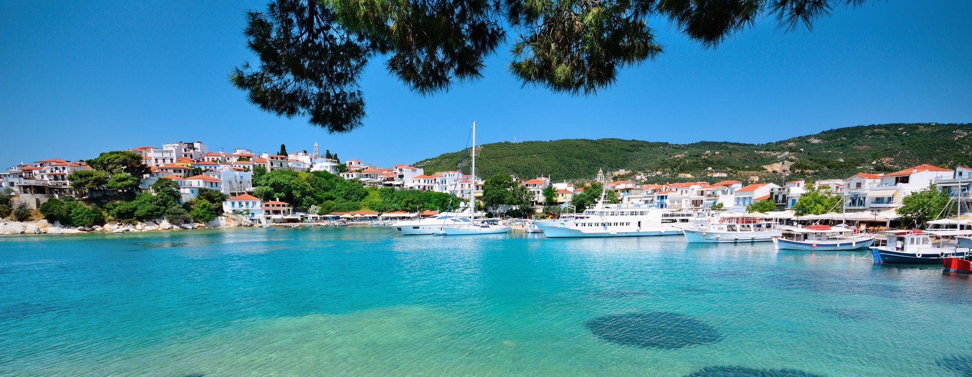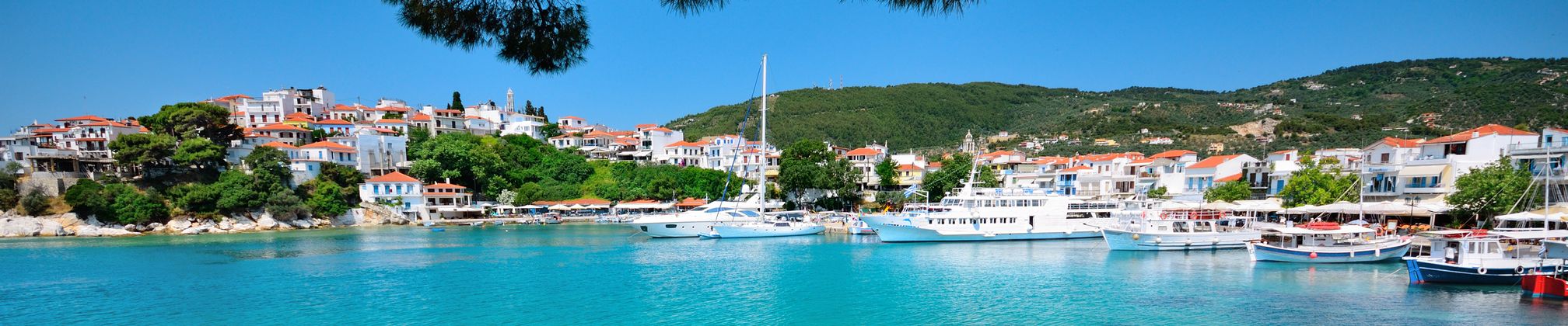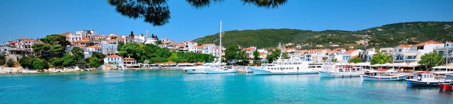 Skiathos ist die Hauptinsel der nördlichen Sporaden – und ein herrliches Badeparadies mit vielen gepflegten Stränden und romantischen Buchten: Der lange Sandstrand von Koukounaries gilt als eine der schönsten Badegelegenheiten der Insel und ist für viele sogar der schönste Strand von ganz Griechenland. Trotz der zahlreichen Besucher während der Hauptsaison konnte Skiathos sich seine ursprüngliche Atmosphäre bewahren. Drehscheibe der Insel ist der lebhafte Hauptort Skiathos-Stadt, der um einen natürlichen Hafen erbaut wurde.