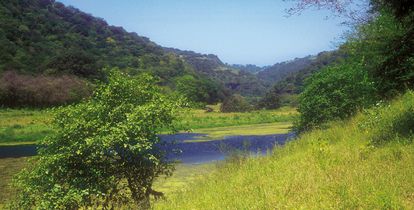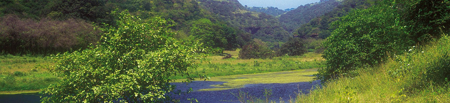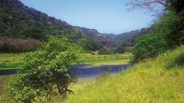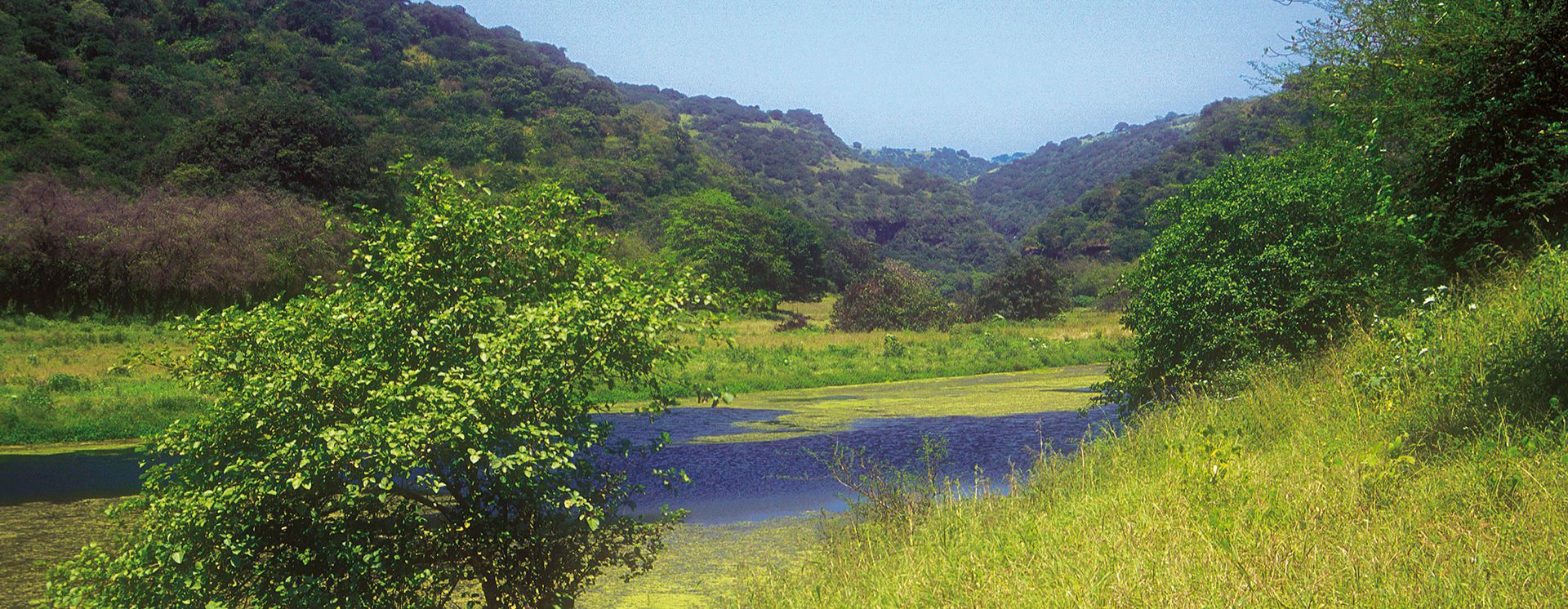 Der Jebel Samhan bildet ein mächtiges Bergmassiv mit Blick über die grüne Küstenebene. Von dort reicht der Blick bei klarer Sicht bis zum Meer. Die Hochebene ist Lebensraum für seltene Tierarten und zeigt, wie stark die Höhenlage die Vegetation verändert.