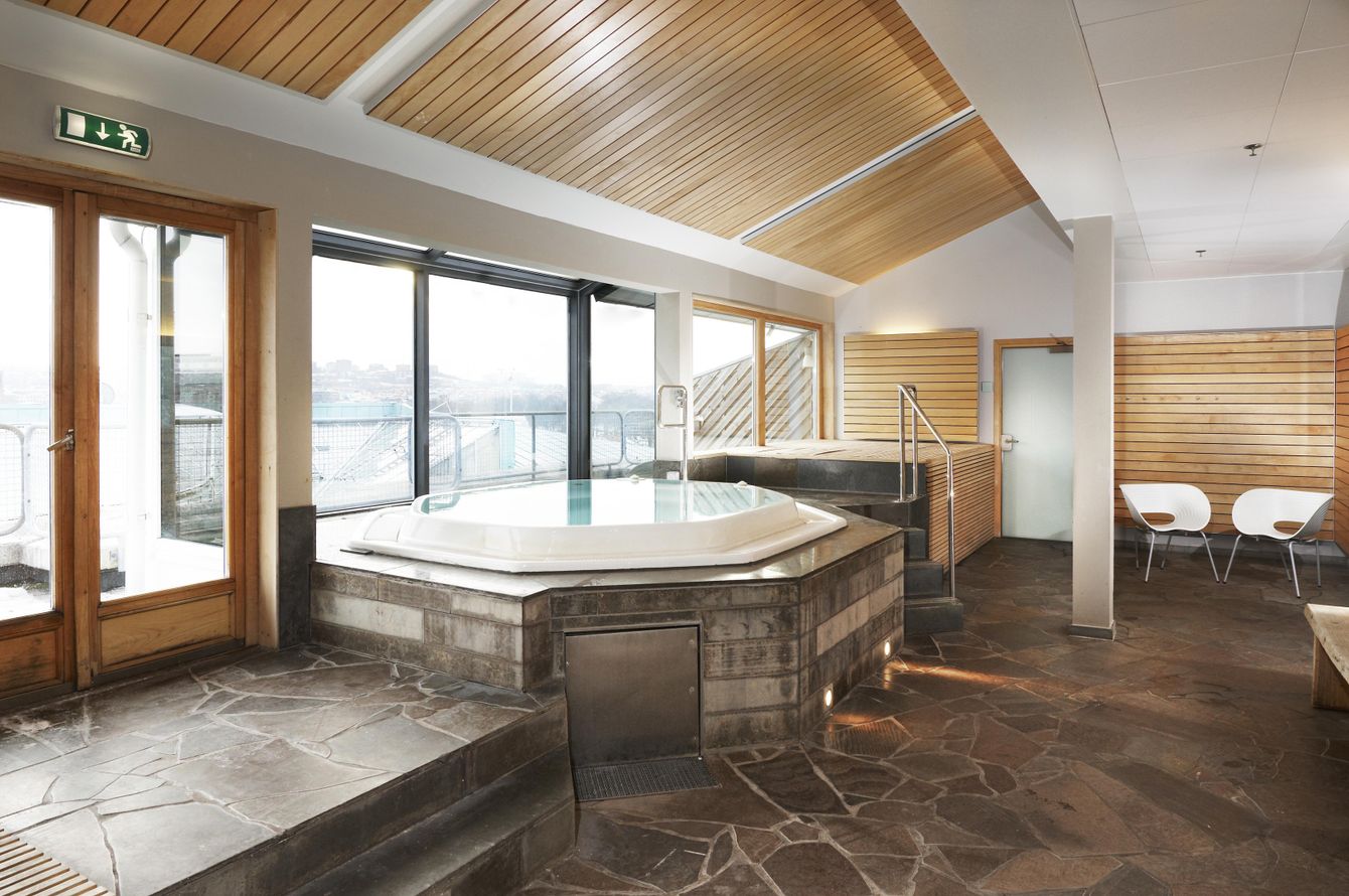 Fitnessraum. Wellness: Sauna und Whirlpool.