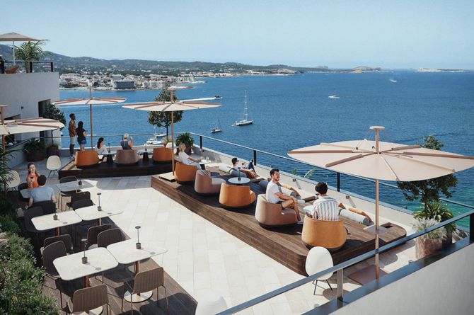 Direkt an der Promenade von San Antonio gelegen. Zum Sandstrand sind es etwa 900 m. Verschiedene Geschäfte, Restaurants und Bars liegen in unmittelbarer Umgebung, darunter das bekannte Café Mambo sowie das Café del Mar, die nur etwa 100 m entfernt sind. Der Hafen ist rund 400 m entfernt. Bis zum Flughafen Ibiza sind es ungefähr 25 km.
