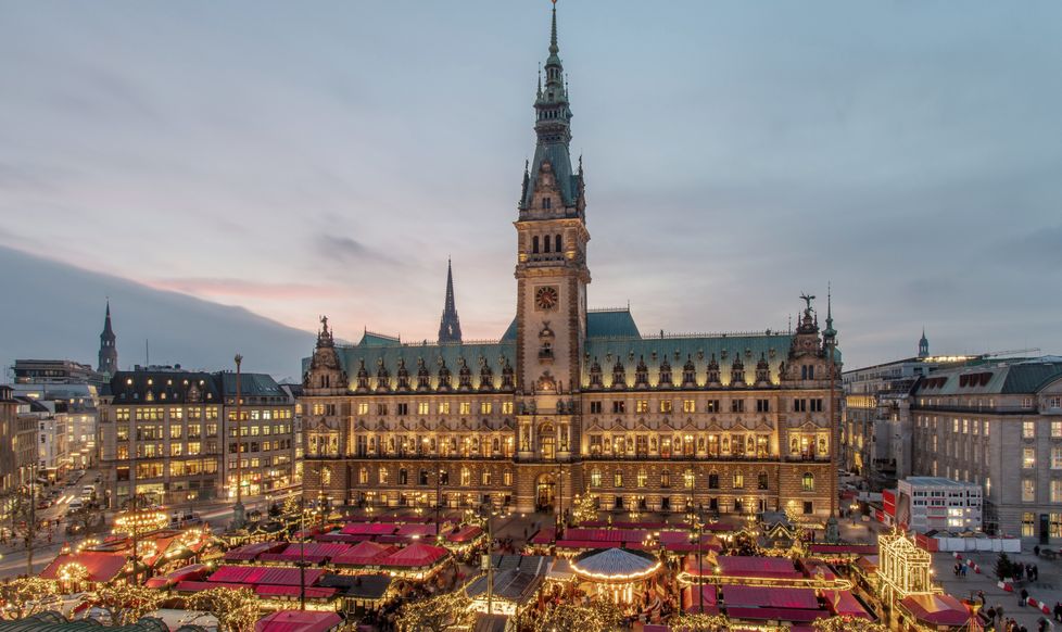 Der Weihnachtsmarkt vor dem Hamburger Rathaus ist während der Adventszeit ein beliebter Treffpunkt bei den Einheimischen. Zu den Highlights gehört der fliegende Weihnachtsmann, der dreimal täglich über die Köpfe der Besucher hinweg fliegt. Zur gleichen Zeit finden zahlreich andere Weihnachtsmärkte statt und machen Hamburg zu einer beliebten Adventstripdestination.